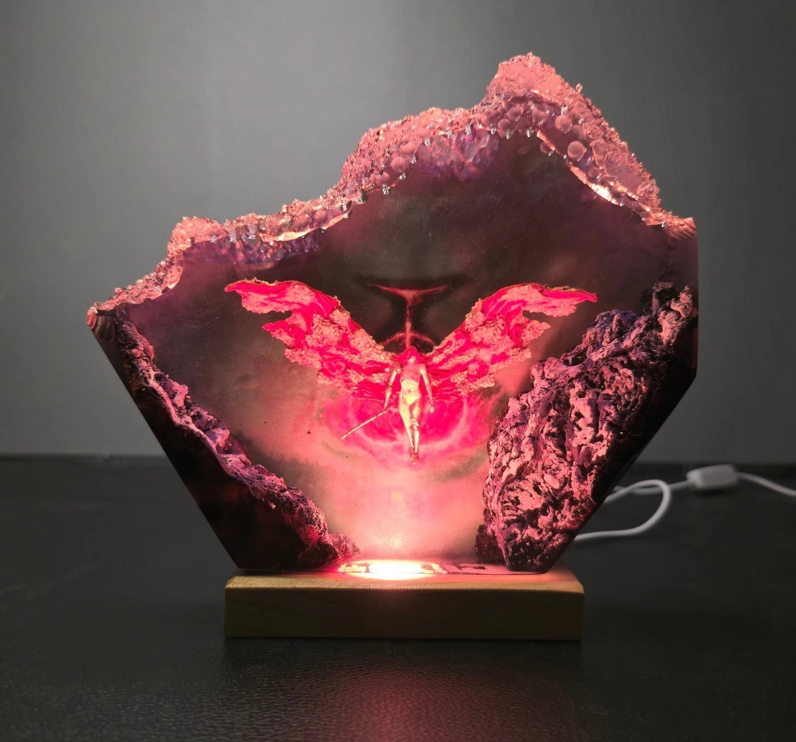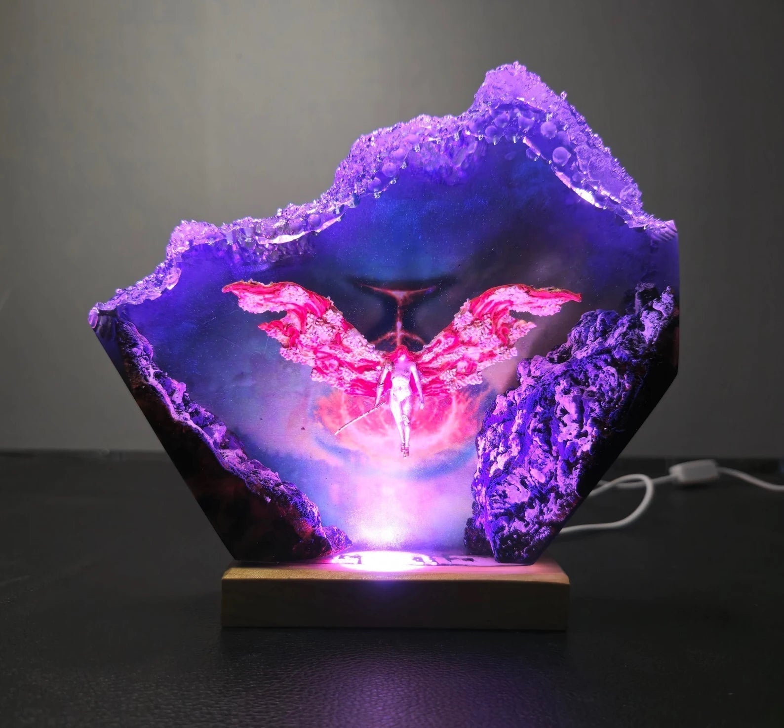 Specifications: Size M: 7"x5.3" Size L: 8.5"x6.4" Size XL: 10"x7.6" Purely handmade, there will be errors in shape and size. Wattage: 1-2W LED Colorful Wired/Wireless: USB Wired Remote control: Yes Adapter: NO Material: Wood, Epoxy Resin, Polymer Clay. Crafted handmade 100% by Artfigu. Good for people, good for the planet. ⚠ Please note: Please note that the shades and colors displayed on your screen may differ from the originals due to variations in screen settings. Each piece of art is meticulously handmade, and as a result, any subsequent copy may not be 100% identical to the photo shown or the original. Additionally, the size of each piece may vary